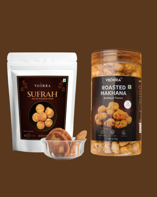 Enjoy the best of both worlds with the VEÓRRA Snack Combo, bringing together the warmth of traditional flavours and the goodness of healthy snacking. This thoughtfully curated combo pairs SUFRAH – Maa Ke Haath Ka Swad, a classic homemade-style fried snack, with VEÓRRA Roasted Makhana – Barbeque Flavour, a light, crunchy, and guilt-free delight.